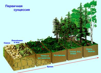 У природі первинні сукцесії зустрічаються порівняно рідко і продовжуються значно довше вторинних — до декількох сторіч. Первинна сукцесія — це заростання місця, раніше не зайнятого рослинністю: голих скель або застиглої вулканічної лави. Жити на такому ґрунті здатні лише деякі рослини, них називають піонерами сукцесій. Типові піонери — мохи і лишайники. Вони змінюють ґрунт, виділяючи кислоту, що руйнує і розпушує камені [4]. Мохи, що відмирають, і лишайники під дією бактерий-редуцентов розкладаються, а їхні залишки перемішуються з пухким кам'янистим субстратом (піском). Так утвориться перший ґрунт, на якій уже можуть рости інші рослини. Необхідність руйнування материнської гірської породи — головна причина повільного ходу первинних сукцесій; відзначте збільшення товщини ґрунтового шару в міру сукцесії. На ґрунті, бідної живильними речовинами, поселяються трави, що більш конкретно здатні і витісняють лишайники і мохи. Корені трав проникають у тріщини кам'янистої породи, розсовують ці тріщини і руйнують камінь усе більш. На зміну травам приходять багаторічні рослини і чагарники, наприклад, вільха і верба. На коренях вільхи знаходяться клубеньки — спеціальні органи, що містять симбиотические бактерії, що фіксують атмосферний азот і сприяють нагромадженню в ґрунті великих його запасів, за рахунок чого ґрунт стає усе більш родючою. Тепер на ній уже можуть рости дерева, наприклад сосна, береза і ялина. Таким чином, рушійною силою сукцесії є те, що рослини змінюють ґрунт під собою, впливаючи на її фізичні властивості і хімічний склад, так що вона стає придатної для виглядів-конкурентів, що витісняють первісних мешканців, викликаючи зміну співтовариства — сукцесію (згадаєте ілюстрації до параграфа 1.4: у силу конкуренції рослини далеко не завжди живуть там, де умови для них краще).