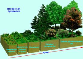 У місцях, де господарська діяльність людей не утручається у взаємини організмів, складається климаксовое співтовариство, що може існувати невиразно довгий час — доти, поки який-небудь вплив ззовні (оранка землі, рубання лісу, пожежа, виверження вулкана, повінь) не порушить його природну структуру. У випадку руйнування співтовариства в ньому починається сукцесія — повільний процес відновлення вихідного стану. Приклади вторинних сукцесій: заростання закинутого поля, лугу, гари або вирубки. Вторинна сукцесія триває кілька десятків років. Вона починається з того, що на звільненій ділянці ґрунту з'являються однолітні трав'янисті рослини. Це — типові бур'яни: кульбаба, осот, мати-і-мачуха й інші. Їхня перевага в тім, що вони швидко розростаються і роблять насіння, пристосовані до поширення на далекі відстані за допомогою вітру або тварин. Однак уже через два-три роки їх витісняють конкуренти — багаторічні трави, а потім — чагарники і дерева, насамперед осика. Ці породи затінюють землю, а їх великі кореневі системи забирають із ґрунту усю вологу, так що проросткам видів, першими попавших на поле, стає важко рости. Однак сукцесія на цьому не зупиняється; за осикою з'являється сосна; а останніми — повільно зростаючі тіньовитривалі породи, наприклад ялина або дуб. Через сто років на цій ділянці відновлюється те співтовариство, що було на місці полючи до зведення лісу й оранки землі [4].