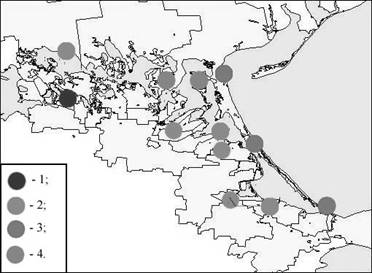 На рис. 4.1 показано карту-схему, де позначено рекомендовані місця розміщення стаціонарних постів спостережень на Сиваші. Відповідно до цієї схеми на Сиваші має бути 1 поста категорії І, 6- категорії ІІ, 3 — категорії ІІІ, та 2- категорії 4. Усього 12 стаціонарних постів спостереження.За умови відсутності достатнього фінансування можна скоротити кількість пости спостереження – залишити їх в районах найбільшого антропогенного навантаження. Озерні екосистеми це специфічні об’єкти, які потребують спеціальних методів дослідження і спеціальних програм спостереження. У пунктах 1 та 2 категорій спостереження за гідробіологічними показниками рекомендують проводити щомісячно за скороченою програмою, щоквартально за повною програмою; в пунктах 3 категорії спостереження проводять щомісячно за скороченою програмою тільки у вегетаційний період та щоквартально за повною програмою; в пунктах 4 категорії спостереження слід проводити щоквартально за повною програмою [33]. Досліджуваний хімічний та параметричний склад, визначається відповідно до програм спостереження, що застосовуються на постах спостереження різної категорії.