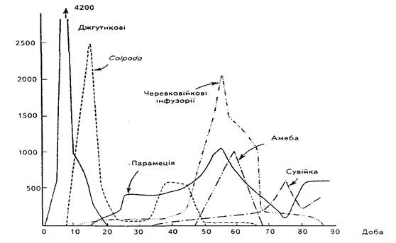 Рис.1. Сукцесії простіших в настої сіна. Зміна кількості особин залежно від віку культури, в днях: По осі ординат — кількість індивідів різних видів в см.