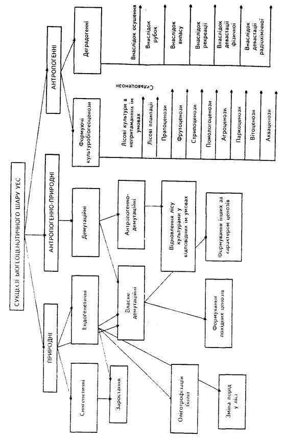 Сьогодні, коли ми маємо справу з численними антропогенними сукцесіями, їх поділяють на культурні (створення культур фітоценозів) і акультурні, або деградаційні (рис.2).