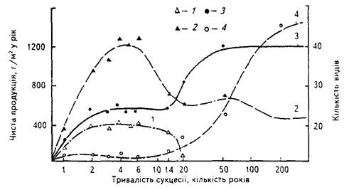 Рис. 3. Зміна видового різноманіття і чистої первинної продукції в ході сукцесії. Що веде до встановлення клімаксового мішаного лісу із сосни та дуба: 1 — трав’яні рослини, 2 — чагарники, 3 — сосна, 4 — луб.