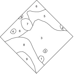 Схема рослинного покриву на пробній площі (нумерація виділів — в тексті) |