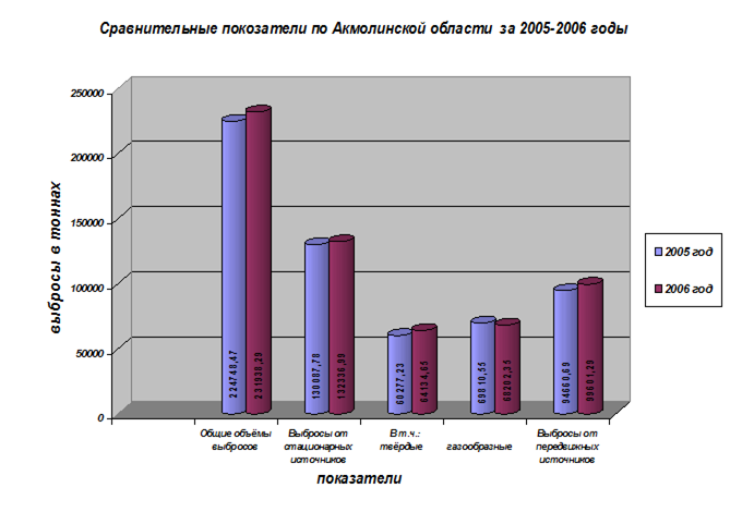 Общий объём выбросов от стационарных и передвижных источников выбросов Акмолинской области при сравнении данных за 4-ый квартал 2005 года (67798,60 тонны) и 4 -ый квартал 2006 года (63545,54 тонны) показывает уменьшение показателей отчётного квартала на 6,3%. Годовые же показатели, наоборот, увеличиваются: за 2005 год общий объём выбросов составил 224748,47 тонны, а за 2006 год – 231938,29 тонны, или на 3,2% больше. Данный рост произошёл за счёт активизации деятельности промышленных предприятий.