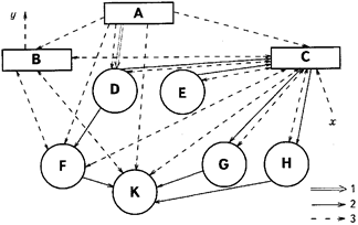 Рис. 1. Потоки непревратимой и сильные потоки превратимой энергии между основными блоками экосистемы: 1 — превратимая энергия фотосинтетически активной радиации (ФАР); 2 — превратимая энергия химических связей; 3 — потоки тепла (непревратимой энергии); х — поток внутреннего тепла Земли, у — тепловое излучение в космос. Блоки: А — радиация Солнца, В — атмосфера; С — почвогрунт, D — фотоавтотрофные организмы; Е — хемоавтотрофные организмы; F — хемогетеротрофы-биофаги первого порядка; G — хемогетеротрофы-сапрофаги; Н — прототрофы-сапрофаги; К — хемогетеротрофы-биофаги высших порядков.