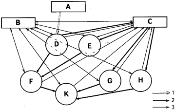 Если попытаться представить графически потоки энергии, вещества и информации между выделенными девятью блоками, то получится весьма сложная и трудно читаемая картина. Поэтому целесообразно привести две схемы, которые показывают характер вещественно-энергетических взаимосвязей в экосистеме (см. рис. 1,2). Потоки вещества, в принципе, могут иметь характер круговорота в замкнутом цикле. Значительная часть химических элементов действительно с той или иной скоростью длительное время циркулирует в экосистеме. Однако для некоторых задач нужно иметь в виду, что полной замкнутости даже по веществу не достигается ни в отдельной экосистеме, ни в биосфере в целом. Часть вещества из блока С переходит в геологические циклы с совершенно иной шкалой времени, часть из блока В диссипируется за пределы биосферы. Элемент А, естественно, не связан вещественными взаимодействиями с другими блоками.
