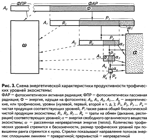 Потоки превратимой энергии однонаправлены. Фотосинтетически активная радиация (ФАР) идет от А к D и затем происходит дальнейшая трансформация энергии химических связей органических веществ. Несколько особняком стоит взаимосвязь С-Е. Элемент В не участвует в трансформации превратимой энергии. Непревратимая энергия (тепло) не может служить источником для непосредственного использования организмами, однако является условием протекания многочисленных взаимодействий.