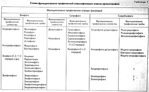 Дальнейшее разделение (или объединение) идет по функционально-трофическим семействам. Так, сапрофаги объединяют семейства детритофагов, копрофагов, некрофагов. Биофаги включают представителей хлорофитофагов (потребителей зеленых растений), ахлорофитофагов (потребителей не зеленых растений), зоофагов, зоофитофагов. Семейства далее распадаются на функционально-трофические трибы. Например, хлорофитофаги содержат следующие трибы: филлофагов, ризофагов, ксилофагов, карпофагов, антофилов.