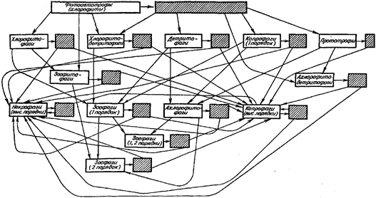 Заштрихованные блоки — отмершая биомасса и соответствующая ей энергия. Отражены лишь энергетические каналы. Если построить также каналы взаимовлияний, то в системе «потребитель потребляемый» в случае потребления энергии живой биомассы чаще выявляется отрицательная обратная связь, в случае потребления энергии отмершей биомассы — положительная обратная связь. Однако всегда сила и характер связи в таких «замкнутых контурах» меняются во времени даже на одних участках трофической сети (метастабильное состояние)