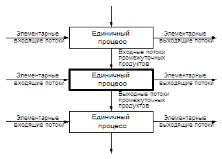 Продукционная система подразделяется на несколько единичных процессов. Единичный процесс — наименьшая часть продукционной системы, используемая в качестве самостоятельной функциональной единицы, при проведении оценки по ПЖЦ. Единичные процессы связаны: друг с другом элементарными потоками промежуточных продуктов и (или) отходов, проходящих последующую переработку; с другими продукционными системами потоками продукции; с окружающей средой элементарными потоками сырья, энергии, выбросов, сбросов, отходов.