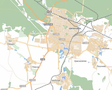 З інтернет-ресурсу [2] ми бачимо, що Шепетівка – місто обласного підпорядкування, яке знаходиться у північній частині Хмельницької області (Координати: 50°11′08″ пн. ш. 27°04′06″ сх. д. Висота над рівнем моря — 254 м). Площа міста — 3765 га. Станом на 01.01.2010 року чисельність населення міста становило 43,7 тис. чоловік. Місто розкинулось на відрогах Волинсько–Подільської височини на межі Полісся з Лісостепом по обидва боки річки Гуски, що впадає в повноводну Горинь, притоку Прип’яті. Територія міста представлена полого-хвилястою поверхнею. Клімат міста – помірно-континентальний. Середньорічні температури: літня – плюс 19 градусів, зимова – мінус 3 градуси. Максимальна літня температура – плюс 36-38 градусів, зимова – мінус 31-35 градусів. Середньорічна кількість опадів – 510-580 мм. Серед ґрунтів поширеними є: чорноземи опідзолені легко суглинисті, дерново-підзолисті, глинисто-піщані, лучні легкосуглинкові ґрунти. Відстань до обласного центру шосейними дорогами становить 100 км, залізницею — 129 км. Шепетівка – важливий вузол залізничних шляхів, має пряме сполучення в 5-ти напрямках з усіма регіонами України, а також із зарубіжжям. Через місто проходять автошляхи державного значення (Городище – Рівне — Старокостянтинів) та територіального значення (Шепетівка – Чуднів – Бердичів та Шепетівка – Новоград — Волинський). Корисні копалини м. Шепетівка представлені родовищами мінерально- радонових вод та граніту. Шепетівське родовище мінеральних радонових вод розміщене у північно-східній частині міста ( площа — 9 кв. км).На його території знаходиться 7 свердловин, які на теперішній час не експлуатуються. Родовище граніту та грандіориту осницького комплексу розміщене в східній частині міста.
