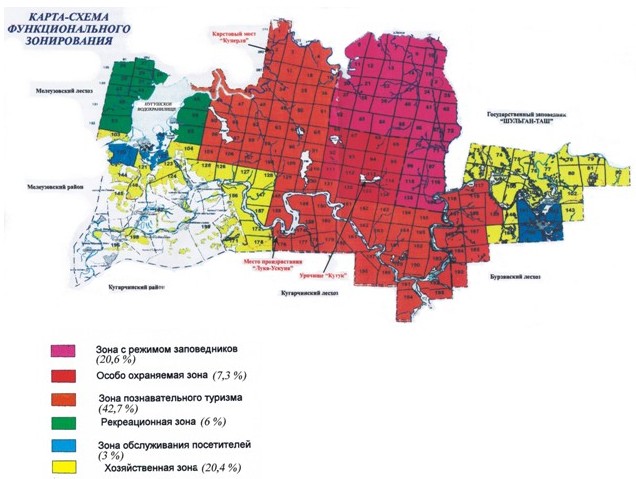 Особо охраняемая и заповедная зона образуют экологическое ядро территории. Общая их площадь должна составлять не менее 25% всей территории парка, а на территории НП «Башкирия» их сумма составляет 28,1%.