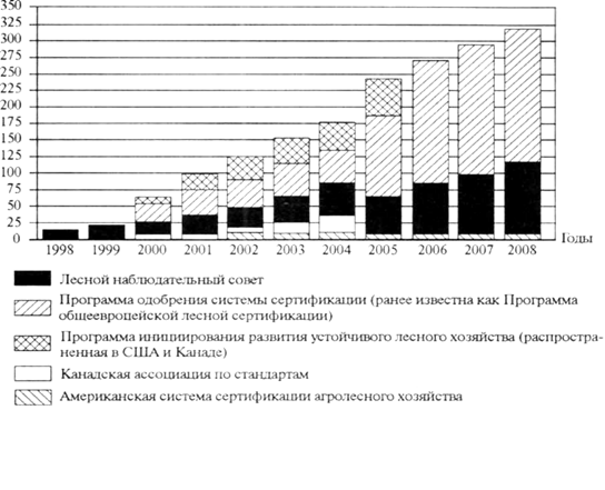 Эколого-экономические проблемы совершенствования экологической сертификации лесов рассматриваются во многих научных работах. Именно они дали импульс для развития экологической сертификации по схемам Лесного наблюдательного совета, Панъевропейского комитета лесного хозяйства, Международной организации по стандартизации (ISO), Американской ассоциации предприятий лесной и бумажной промышленности. Как показано на рисунке, площадь сертифицированных лесов в мире динамично возрастает: в 2008 г. она составляла 320 млн. га, то есть 8,3% глобальной лесной площади.
