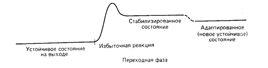 За исходным состоянием в ответ не воздействие стрессора (если его доза не превышает летальный уровень) прежде всего, следует избыточная реакция, которая через стабилизированное состояние ведет к состоянию приспособленности (новое состояние адаптированности).