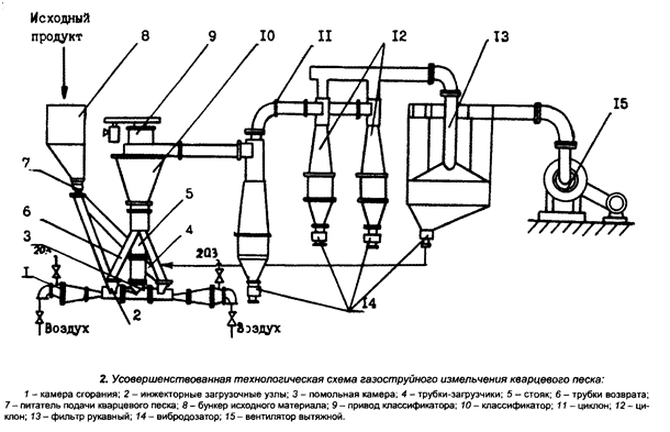 Промышленная установка газоструйного измельчения кварцевого песка представлена на р и с. 2.