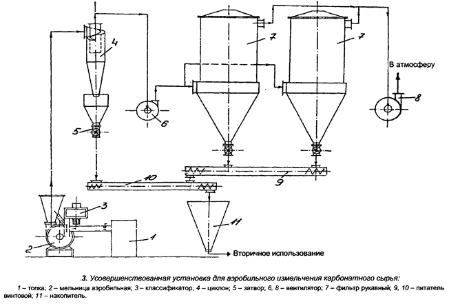 На рис. 3 представлена усовершенствованная технологическая схема аэробильного измельчения известняка и доломита, реализованная на заводах стеклянного волокна.