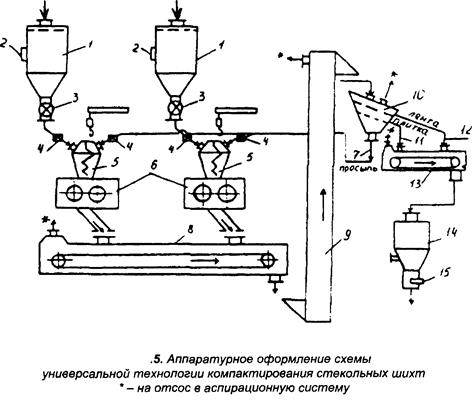 Далее компактированная шихта поступает на конвейер 8 и элеватором 9 подается для классификации в грохот 10 в зависимости от требований производства на плитку или ленту 11 и 12. Конвейером 13 готовый продукт направляется в бункер-накопитель 14 с шибером 15, а из него — на склад или в стекловаренную печь.