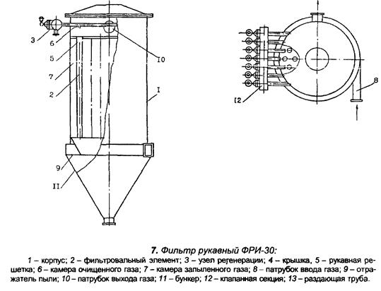 -две ступени очистки: 1-я ступень — инерционный осадитель грубых частиц и 2-я ступень тонкой очистки от сухой пыли на рукавном фильтре с механическим отряхиванием;