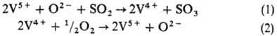 Сырьем для получения серной кислоты служат: S, сульфиды металлов, H2S, отходящие газы теплоэлектростанций, сульфаты Fe, Ca и др. Основные стадии получения серной кислоты: 1) обжиг сырья с получением SO2; 2) окисление SO2 до SO3 (конверсия); 3) абсорбция SO3. В промышленности применяют два метода получения серной кислоты, отличающихся способом окисления SO2, — контактный с использованием твердых катализаторов (контактов) и нитрозный — с оксидами азота. Для получения серной кислоты контактным способом на современных заводах применяют ванадиевые катализаторы, вытеснившие Pt и оксиды Fe. Чистый V2O5 обладает слабой каталитической активностью, резко возрастающей в присутствии солей щелочных металлов, причем наибольшее влияние оказывают соли К. Промотирующая роль щелочных металлов обусловлена образованием низкоплавких пиросульфованадатов (3К2S2О7 · V2О5, 2К2S2O7 · V2O5 и K2S2O7·V2O5, разлагающихся соответственно при 315-330, 365-380 и 400-405 °С). Активный компонент в условиях катализа находится в расплавленном состоянии.