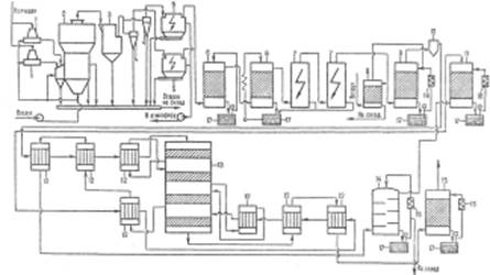 1 — тарельчатый питатель; 2 — печь; 3 — котел-утилизатор; 4 — циклоны; 5 — электрофильтры; 6 — промывные башни; 7 — мокрые электрофильтры; 8 — отдувочная башня; 9 — сушильная башня; 10 — брызгоуловитель; 11 — первый моногидратный абсорбер; 12 — теплообменники; 13 — контактный аппарат; 14 — олеумный абсорбер; 15 — второй моногидратный абсорбер; 16 — холодильники; 17 — сборники.