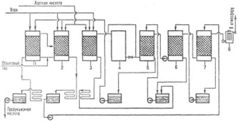 1 — денитрационная башня; 2, 3 — первая и вторая продукционные башни; 4 — окислительная башня; 5, 6, 7 — абсорбционные башни; 8 — электрофильтры.