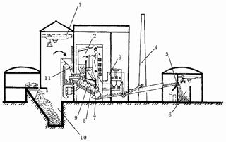 1 – мостовой кран с ковшом; 2 – парогенератор; 3 – электрофильтр; 4 – дымовая труба; 5 – сепаратор; 6 – склад шлака; 7 – механизм шлакоудаления; 8 – подпорный валик колосниковой решетки; 9 – обратно переталкивающая колосниковая решетка; 10 – приемный бункер; 11 – бункер котлоагрегата.