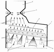 1 – летучие компоненты; 2, 8 – первичный воздух; 3 – провал и шлак; 4 – камера догорания; 5 – вторичный воздух; 6 – бытовые отходы; 7 – топочная камера; 9 – шлак.