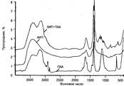 Об образовании водородных связей между двумя полимерами можно судить по изменению ИК-спектров бинарной композиции (рис. 4). В области 1000 — 1500 см-1 появился новый „частокол“ полос поглощения, свидетельствующий о межмолекулярных взаимодействиях в структурированной системе.