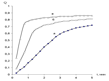 Рис. 1. Зависимость степени осветления (Q) от времени (t) в присутствии флокулянтов с концентрацией 0,75 мг/дм3, доза извести 3,81 мг-экв/дм3, доза коагулянта 0,5 мг-экв/дм3. а – отсутствие флокулянта, б – флокулянт Праестол 650ВС, в – флокулянт Праестол 2530