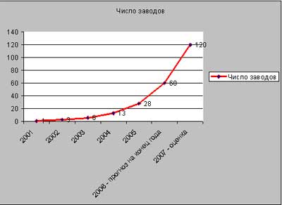 Как показано на рис. 1 число заводов по производству ДТГ, начиная с 2002 года, увеличивалось чуть более чем в 2 раза ежегодно. При этом на сегодняшний день у нас есть все основания полагать, что этот темп роста сохранится в ближайшие 2 года. За прошедшие 12 месяцев по самым скромным подсчетам только западноевропейские поставщики продали в Россию оборудования более чем для 40 заводов. К этому количеству следует прибавить 10-15 заводов, укомплектованных только отечественным оборудованием или линиями, производства стран СНГ и Балтии.