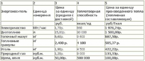 Таблица 1. Оценка топливной составляющей стоимости тепловой энергии при использовании различных видов топлива.