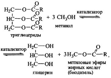 Для современных двигателей широкое распространение получило биодизельное топливо (биодизель), являющееся смесью метиловых или этиловых эфиров жирных кислот. Основой процесса его производства является реакция между триглицеридами и метиловым (этиловым) спиртом в присутствии катализаторов.