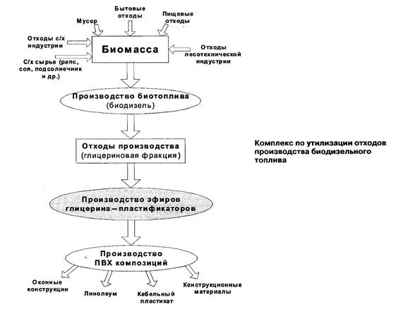 Производство предложенного пластификатора может стать основой для создания индустриального комплекса, реализующего принципы экобизнеса (см. рисунок). В центре комплекса находится перерабатывающее предприятие, сырьем для которого являются отходы заводов, производящих биодизельное топливо как в России, так и за рубежом.