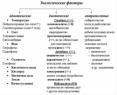 Факторы среды многообразны. Они могут быть необходимы или, наоборот, вредны для живых существ, способствовать или препятствовать выживанию и размножению. Экологические факторы имеют разную природу и специфику действия. Среди них выделяют абиотические и биотические, антропогенные (рис.1).