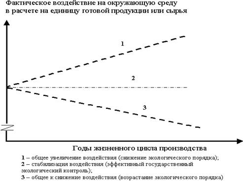 Различия в изменении воздействия производства на окружающую среду, характерные для традиционного экологического управления и экологического менеджмента, показаны на рис.1. Принципиально возможны три основных варианта изменения фактического воздействия на окружающую среду по годам жизненного цикла любого производства, начиная с момента его пуска в эксплуатацию и выхода на проектную мощность: