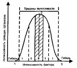 Рис. 14.1. Схема действия экологического фактора на жизнедеятельность организмов: 1, 2. 3 — точки минимума, оптимума и максимума соответственно; I, II, III —зоны пессимума, нормы и оптимума соответственно.