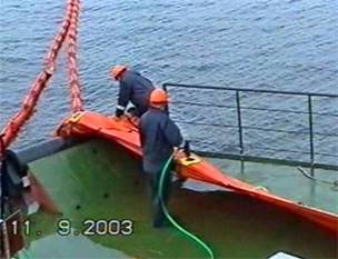 Компактные размеры позволяют погрузить катер на спасательное судно и доставить его к месту разлива.