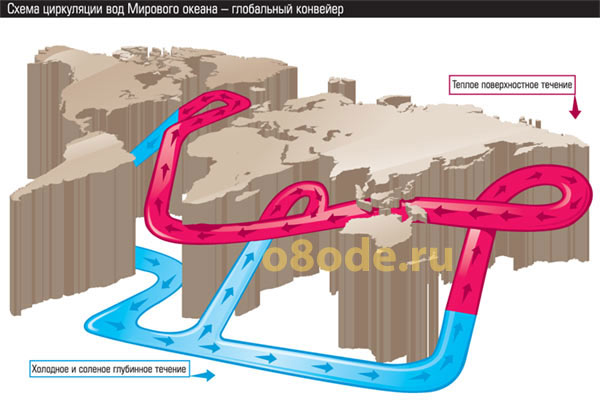 Океанические течения переносят нагретые или охлаждённые воды в другие широты и в значительной мере ответственны за распределение тепла по планете. Поверхностные течения в океане формируются атмосферными ветрами, которые переносят большое количество тепла. На направление течений в Мировом океане оказывает влияние отклоняющая сила, вызванная вращением Земли, — сила Кориолиса. В Северном полушарии она отклоняет течения вправо, а в Южном — влево. Скорость течений в среднем не превышает 10 м/с, а в глубину они распространяются не более чем на 300 м.