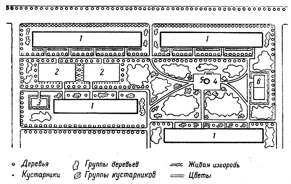 В состав озелененной части микрорайона и квартала обычно входят сад, насаждения на участках при отдельных жилых зданиях или группе зданий (в том числе озеленение перед отдельными зданиями, решенное в виде открытых дворов — курдонеров), защитные посадки по границам микрорайона, вдоль внутримикрорайонных проездов и вокруг хозяйственных и подсобных сооружений Кроме того, в систему озеленения микрорайона входят озелененные участки при школах, общественных учреждениях (рис. 28 — 30) и детских садах-яслях, а также комплекс озелененных спортивных площадок.