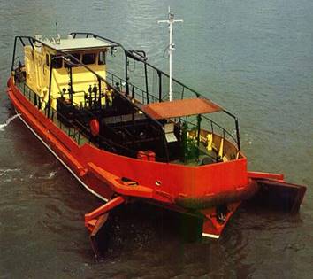 Самоходное судно тримаранного типа с утопленной рубкой, машинным отсеком в средней части, гидравлическим манипулятором предназначено для сбора и транспортировки нефти.