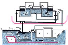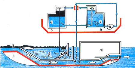 Большинство этих скиммеров по принципу действия являются также пороговыми. Гидродинамические скиммеры основаны на использовании центробежных сил для разделения жидкости различной плотности — воды и нефти. К этой группе скиммеров также условно можно отнести устройство, использующее в качестве привода отдельных узлов рабочую воду, подаваемую под давлением гидротурбинам, вращающим нефтеоткачивающие насосы и насосы понижения уровня за порогом, либо гидроэжекторам, осуществляющим ва-куумирование отдельных полостей. Как правило, в этих нефтесборных устройствах также используются узлы порогового типа.