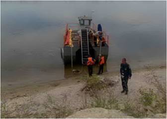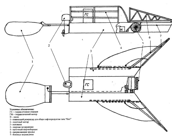 На судне установлен нефтеперекачивающий насос производительностью до 100 м. куб. /ч. Для увеличения количества нефти поступающей к нефтеперекачивающему насосу, судно может быть оборудовано бонами с шириной захвата до 10 м.