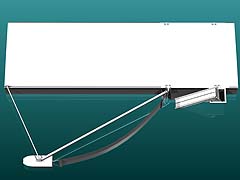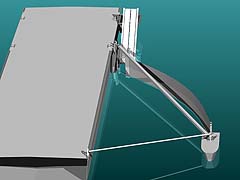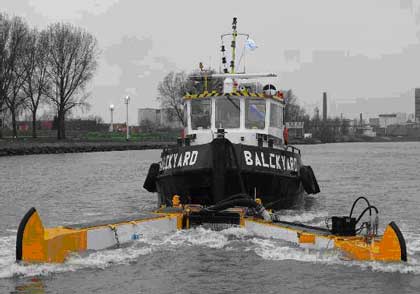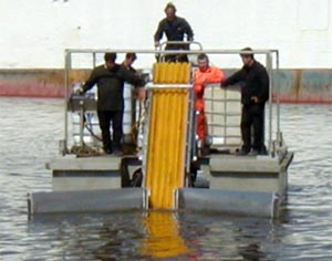 Кроме того, его можно использовать в различных положениях и комбинациях – перед судном-сборщиком, у его борта, с понтоном или боновым заграждением. Испытания показали, что наилучшими параметрами, обеспечивающими качественную зачистку, являются угол раствора 120 градусов при скорости 3.5 узла. Система исполняется в нескольких вариантах, от стальной конструкции длиной 11 метров, шириной сбора 3.7 метра и высотой 1.5 метра, до небольшой аллюминиевой длиной 4 метра. К нефтесборщику прилагается набор из нескольких сьемных типов нефтесобирающих устройств (ловушка, щетки, пояса — weir, brush, belt). Складывающийся Victory Oil Sweeper удобен в экслпуатации и перевозке.