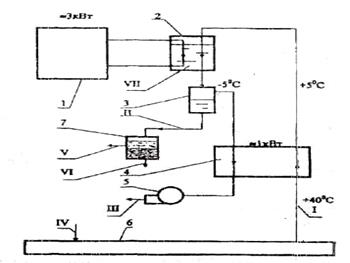 Установка работает следующим образом. Поток I воздухо-паровой смеси при температуре окружающей среды поступает из хранилища бензина 6 в предварительный теплообменник 4, где температура смеси снижается и происходит частичная конденсация паров бензина и воды. После этого смесь направляется в испаритель-конденсатор 2, где температура ее понижается и происходит основная конденсация бензина из смеси. Воздухожидкостный поток поступает в сепаратор 3. Конденсат собирается на дне сепаратора 3, а холодный воздух с остатками паров бензина поступает предварительно в теплообменник 4 обратным потоком, где нагревается до температуры, близкой температуре окружающей среды и через вентилятор 5 (поток III) выбрасывается в атмосферу. Конденсат, представляющий собой водобензиновую жидкую смесь (поток V), поступает в сепаратор 7, где разделяется на воду и бензин вследствие нерастворимости двух жидкостей друг в друге. Вода (поток VI) отводится снизу, бензин (поток V) — из средней части сепаратора 7.