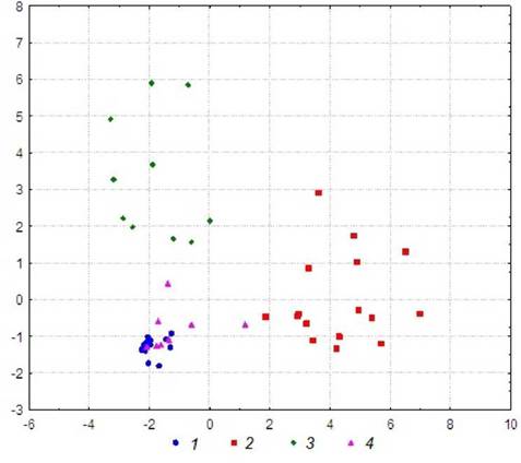 Fig. 1. Points distribution in the principal components axes. 1 — spring, 2 — early summer, 3 — late summer, 4 — autumn