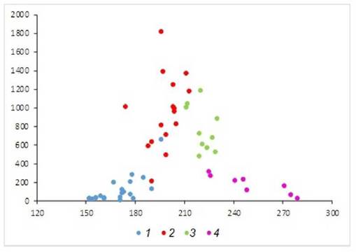 Рис. 1. Распределение данных в осях первых двух компонент. 1 — весна, 2 — раннее лето, 3 — позднее лето, 4 — осень