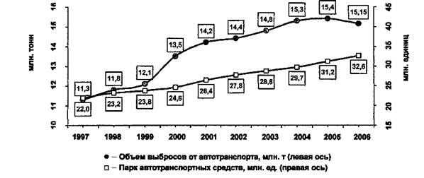 Анализ динамики выбросов загрязняющих веществ в атмосферный воздух Российской Федерации от передвижных источников за последние 10 лет показал [3], что из всего многообразия передвижных источников автомобильный транспорт остается главным загрязнителем атмосферного воздуха. На его долю приходится около 42 % суммарных по России выбросов загрязняющих веществ в атмосферу и 94,5 % — от транспортного комплекса. Интенсивный рост численности автомобильного парка обусловил существенное повышение уровня выбросов загрязняющих веществ. При этом наиболее быстрыми темпами расширяется парк легковых автомобилей и автобусов, парк грузовых автомобилей увеличивается в три раза медленнее. Как видно (см. рисунок),