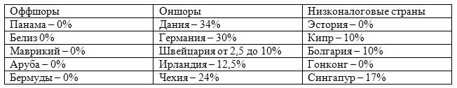 Для налогового планирования в оффшорах и оншорах характерны низкие налоговые ставки, применяемые с целью привлечения максимальных инвестиционных потоков. Однако не со всеми странами данной группы ведущие государства имеют соглашения об избежании двойного налогообложения. В европейском регионе применяются различные дифференцированные ставки налогообложения по налогу на прибыль, кроме того для европейских стран характерно применение налога на добавленную стоимость. В Соединенных штатах используются традиционно одни из самых высоких ставок по налогу на прибыль и отсутствует налог на добавленную стоимость. Азиатский регион имеет ряд особенностей, в том числе связанных с национальным менталитетом, что ярко выражено, например в Японии.