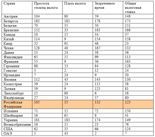 Что касается времени, которое налогоплательщики затрачивают в налоговых инспекциях, то меньше всего времени Багамские острова, Бангладеш, Мальдивы, Люксембург, Оман, Румыния, ОАЭ. Больше всего времени налогоплательщики тратят в таких странах, как Нигерия, Мавритания, Чад, Бразилия, Боливия, Румыния.