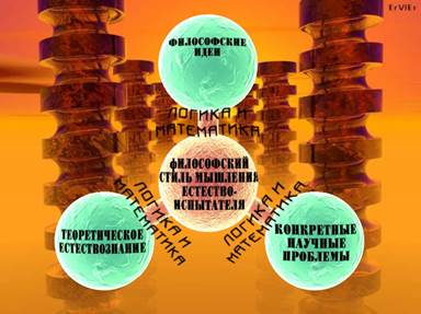 Философский стиль мышления современного естествоиспытателя может быть представлен на основе идей Дж. Смарта и В. Куайна (1) в виде сферы взаимодействия классических и современных философских идей и теоретического естествознания в применении к конкретным полученным результатам исследований. Связующим звеном между философскими концепциями и конкретно научными проблемами и представлениями в этой сфере выступают логика и математика.